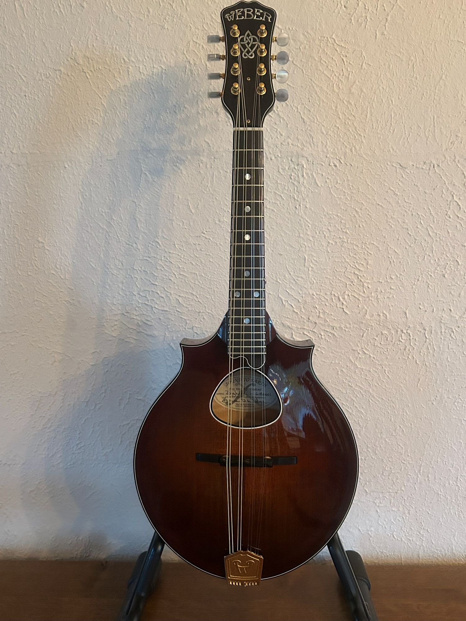 Bound ebony peghead veneer with the ‘Weber’ logo and Celtic knot pearl inlays. Bound, scalloped, and radiused ebony fingerboard with a 1-3/16” bone nut, pearl dot fret markers, and .080 frets.